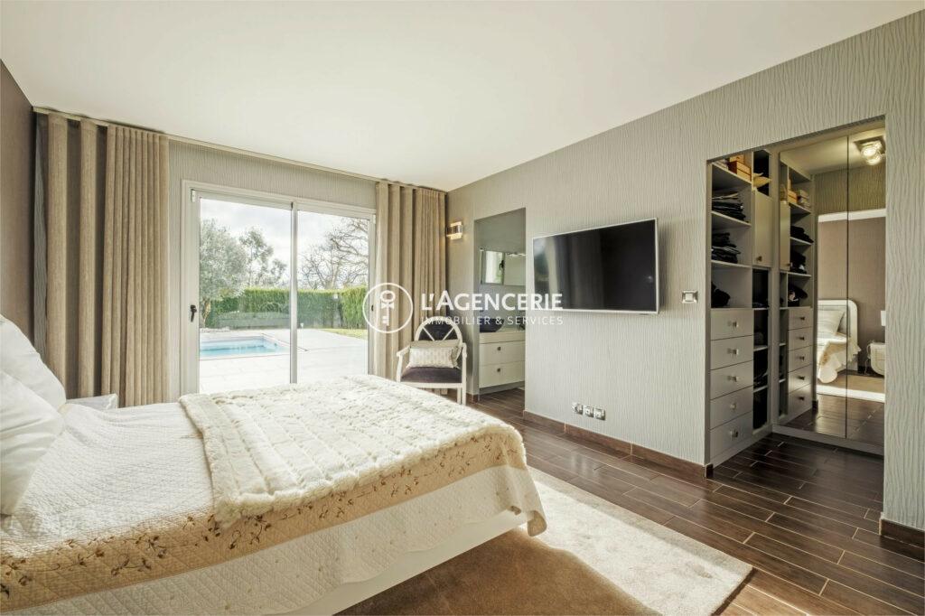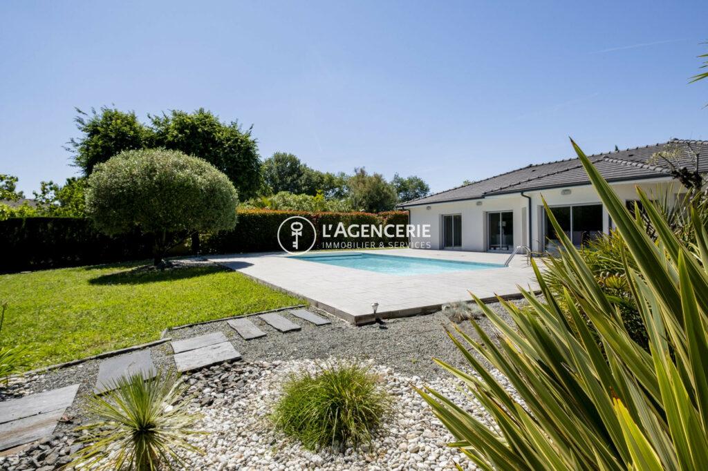A l’extérieur, une terrasse carrelée et semi couverte donnant sur une piscine chlorée (11×5 m) avec pool house, douche et toilettes. Le jardin est bien entretenu avec arrosage automatique.